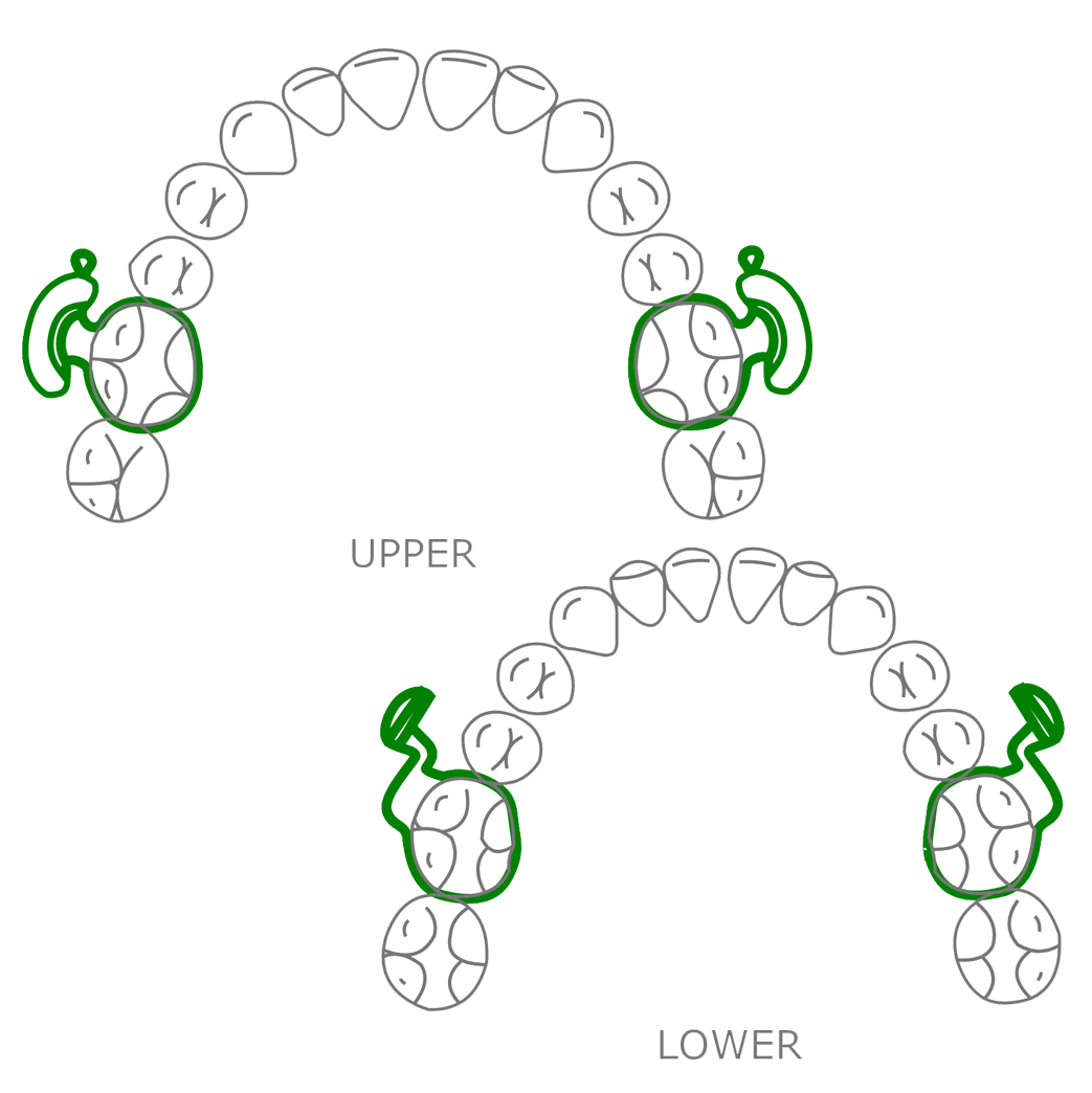 This appliance is often used as a class II bit correction by using independent elbows that engage with the lower buccal cams to advance the lower mandible into a class I position. Shims ranging from 1 to 4 mm may be used to adjust bite advancement and midline alignment.