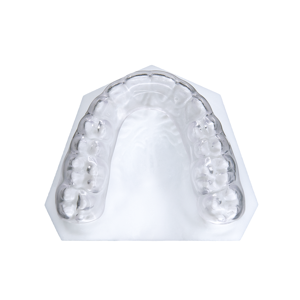 Night guard made with a dual layer material. Leaves a hard shell outer layer and a soft, squishy inner layer. This appliance protects the patient from grinding down their teeth during sleep if the patient suffers from bruxism. The hard outer shell provides the protection, while the inner soft layer provides comfort to the patient when wearing the appliance. Comes in various thicknesses: 1.2mm, 2.5mm, 3mm, and 4mm.
