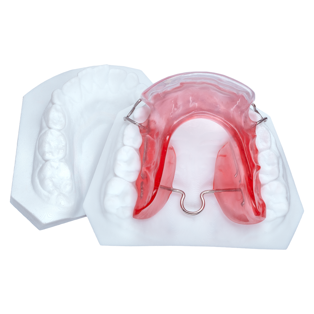 Wire bending technicians will carefully bend and contour the wire around the dental model and then our acrylic techs will pour monomer and polymer on top to form the acrylic.